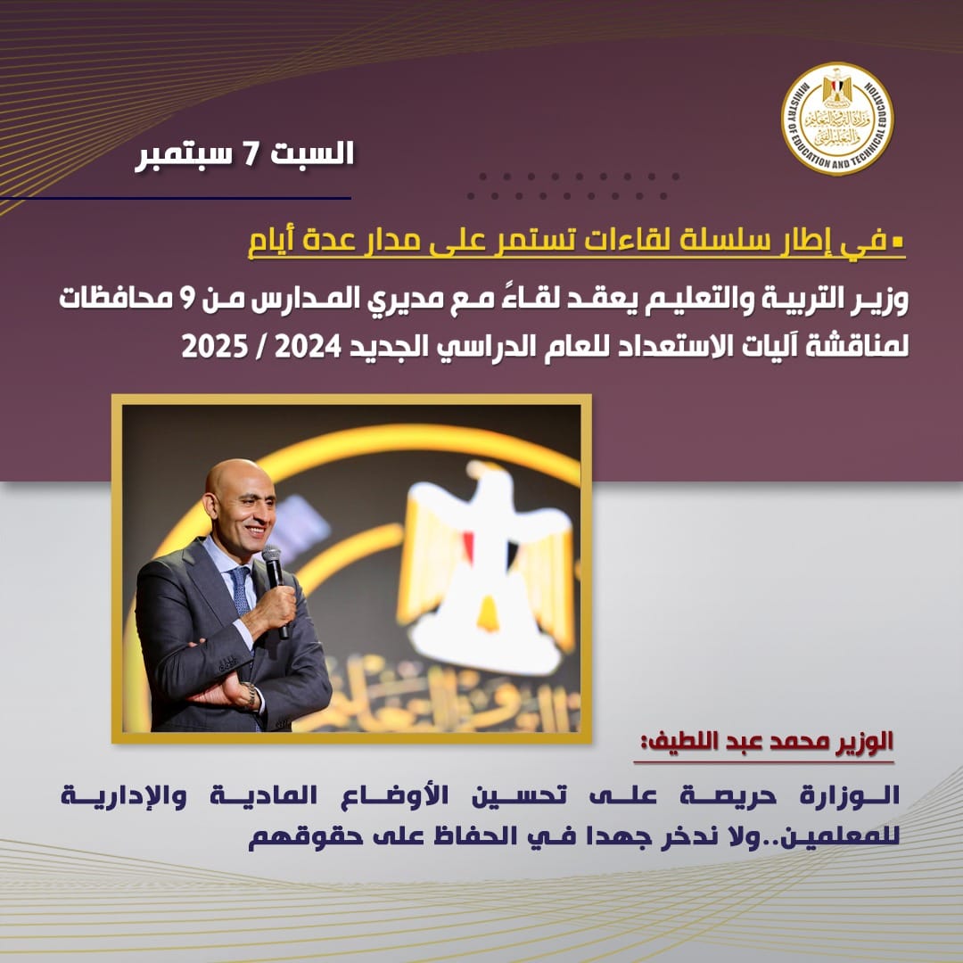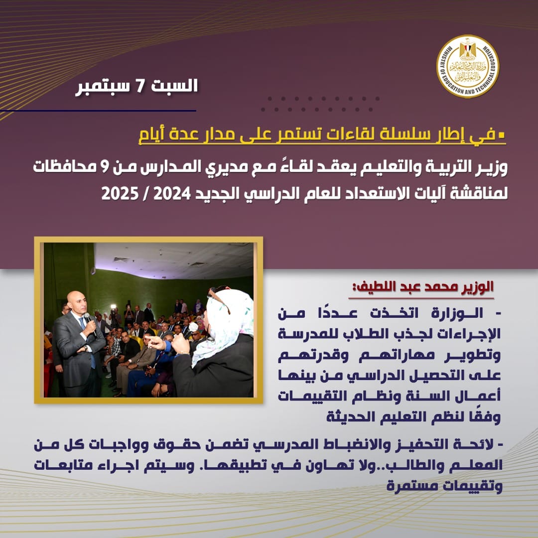 لليوم الثاني على التوالي، واصل السيد/ محمد عبد اللطيف وزير التربية والتعليم والتعليم الفنى، لقاءاته بمقر المدينة التعليمية بالسادس من أكتوبر، مع السادة مديرى المدارس على مستوى ٩ محافظات وهى (الإسكندرية، والبحيرة، والإسماعيلية، والسويس، وجنوب سيناء، وشمال سيناء، وأسيوط، وسوهاج، والمنيا)؛ بإجمالي عدد ١٨٠٠ مدير مدرسة بواقع ٢٠٠ مدير مدرسة من كل محافظة، وذلك بهدف استعراض آليات تنفيذ خطة الوزارة المعلنة خلال الفترة الماضية؛ استعداداً للعام الدراسي الجديد وضمان انطلاق عام دراسي منضبط على مستوى الجمهورية.