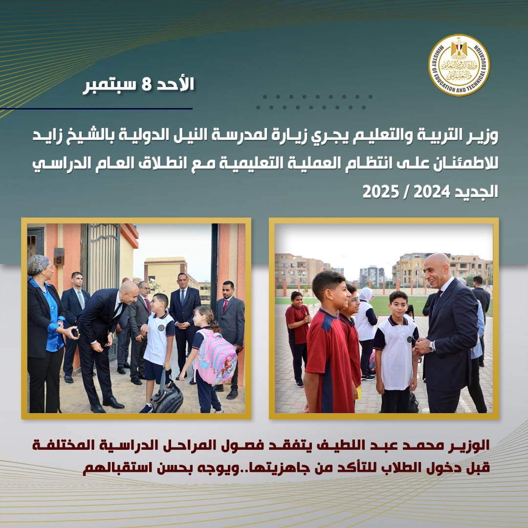 أجرى السيد/ محمد عبد اللطيف وزير التربية والتعليم والتعليم الفني، زيارة لمدرسة النيل الدولية بالشيخ زايد بمدينة ٦ أكتوبر، وذلك للاطمئنان على انتظام العملية التعليمية خلال اليوم الدراسي الأول، حيث ينطلق العام الدراسي الجديد ٢٠٢٤ / ٢٠٢٥ في المدارس الدولية اليوم الموافق ٨ سبتمبر.
