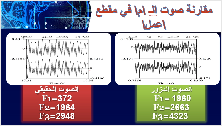 وكانت النتائج، أنظر الرسم (1)، توضح مدى الاختلاف الواسع على مستوى العينتين الصوتيين، والذي من المفترض أنهم لنفس صوت شخص السيد الرئيس، ولكن التحليل الطيفي للصوت أثبت مدى الاختلاف بين الصوتين، مما يؤكد أن هذه التسريبات مزيفة وليست مطابقة لصوت شخص السيد الرئيس. فبمجرد النظر نجد أن ترتيب دورات الموجة الصوتية مختلف تماما بين الصوت الحقيقي (صوت السيد الرئيس في ختام احتفالية قادرون باختلاف) والصوت المزور (صوت السيد الرئيس في فيديو التسريب)، وذلك من حيث التردد الأساسي للصوت (أي عدد اهتزازات الأحبال الصوتية في الثانية الواحدة)، وأيضا من حيث شدة الصوت، التي تعكس قوة الصوت ومدى وضوحه وثقته. وجدير بالذكر أن مدى الاختلاف بين العينتين الصوتيتين، يُعد اختلاف قوي من حيث الجودة والشدة والوضوح، حتى إذا كان في مواقف مختلفة.