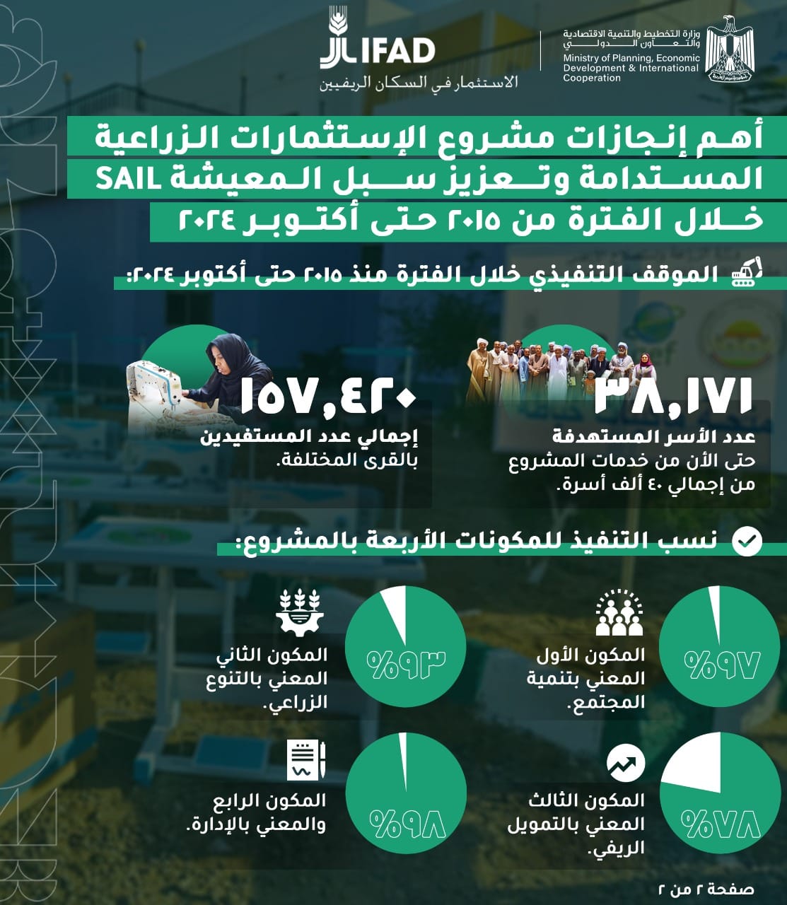 أصدرت وزارة التخطيط والتنمية الاقتصادية والتعاون الدولي تقريرًا حول أهم إنجازات مشروع الاستثمارات الزراعية المستدامة وتعزيز سبل المعيشة SAIL خلال الفترة من 2015 حتى أكتوبر 2024 والذي يتم بالشراكة مع الصندوق الدولي للتنمية الزراعية "ايفاد"، وتنفذه وزارتا الموارد المائية والري، والزراعة واستصلاح الأراضي، وذلك تزامنًا مع الجولة التفقدية التي قامت بها الدكتورة رانيا المشاط وزيرة التخطيط والتنمية الاقتصادية والتعاون الدولي لتفقد أنشطة المشروع بقرى محافظة المنيا.