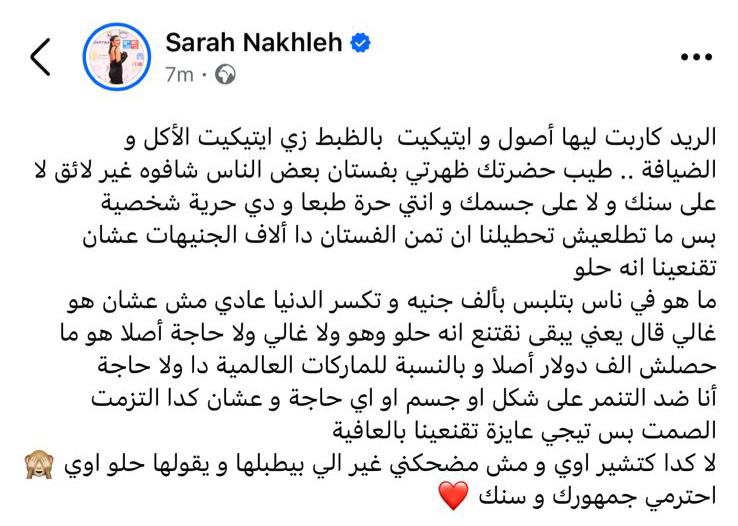 وكتبت سارة: الريد كاربت ليها أصول وإتيكيت بالظبط زي إتيكيت الأكل والضيافة. حضرتك ظهرتي بفستان بعض الناس شافوه غير لائق لا على سنك ولا على جسمك، وانتي حرة طبعًا ودي حرية شخصية. بس ما تطلعيش تحطيلنا إن تمن الفستان دا آلاف الجنيهات عشان تقنعينا إنه حلو. ما هو في ناس بتلبس بألف جنيه وتكسر الدنيا عادي، مش عشان هو غالي يبقى نقتنع إنه حلو.”