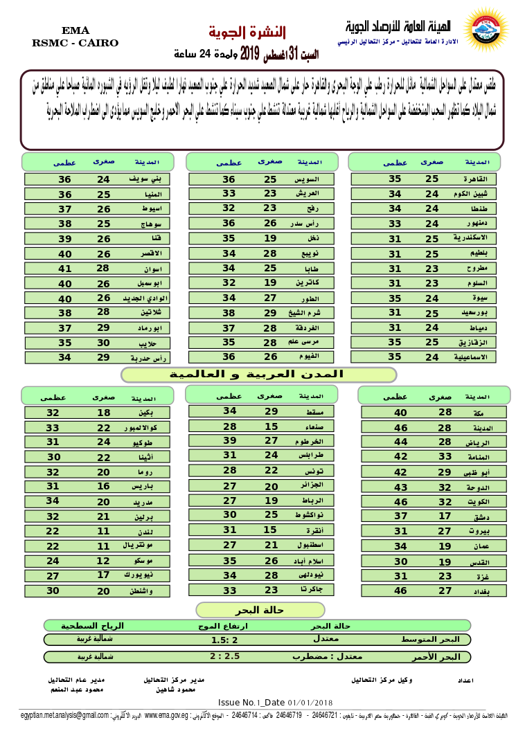 وبالنسبة لحالة البحر المتوسط، تكون معتدلة إلى مضطربة شرقا، وارتفاع الموج فيه من مترين إلى مترين ونصف، والرياح السطحية شمالية غربية، وحالة البحر الأحمر معتدلة، وارتفاع الموج فيه من متر ونصف إلى مترين والرياح السطحية شمالية غربية.