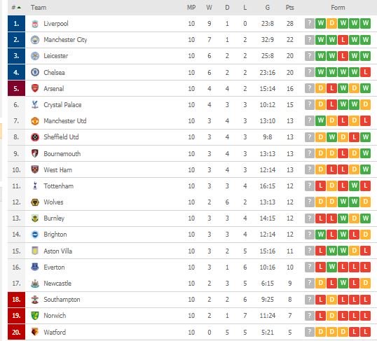 وجاء ترتيب الدوري الإنجليزي بعد نهاية الجولة العاشرة كالآتي