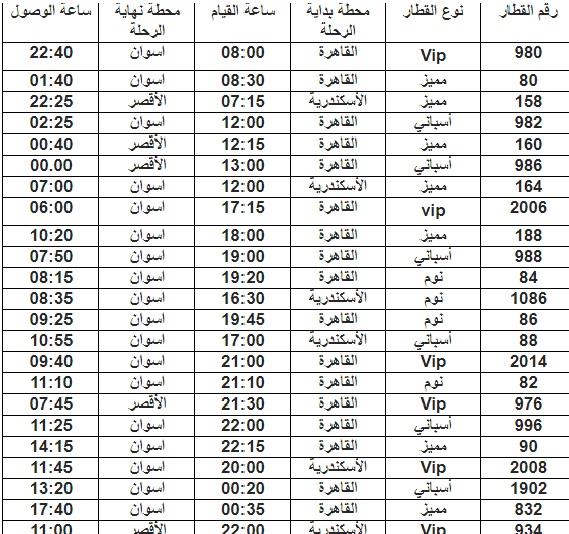 وشملت التعديلات على المواعيد، القطارات المكيفة والـ vip على خطوط «القاهرة-أسوان» والعكس، وكذلك المميز «الإسكندرية- أسوان»، إضافة إلى قطارات النوم وغيرها.