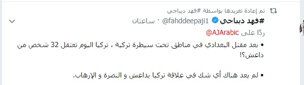 وقال الكاتب السعودى، فى تغريدة له عبر حسابه الشخصى على "تويتر"، إنه بعد مقتل البغدادي في مناطق تحت سيطرة تركية، تركيا اليوم تعتقل 32 شخصا من داعش!.