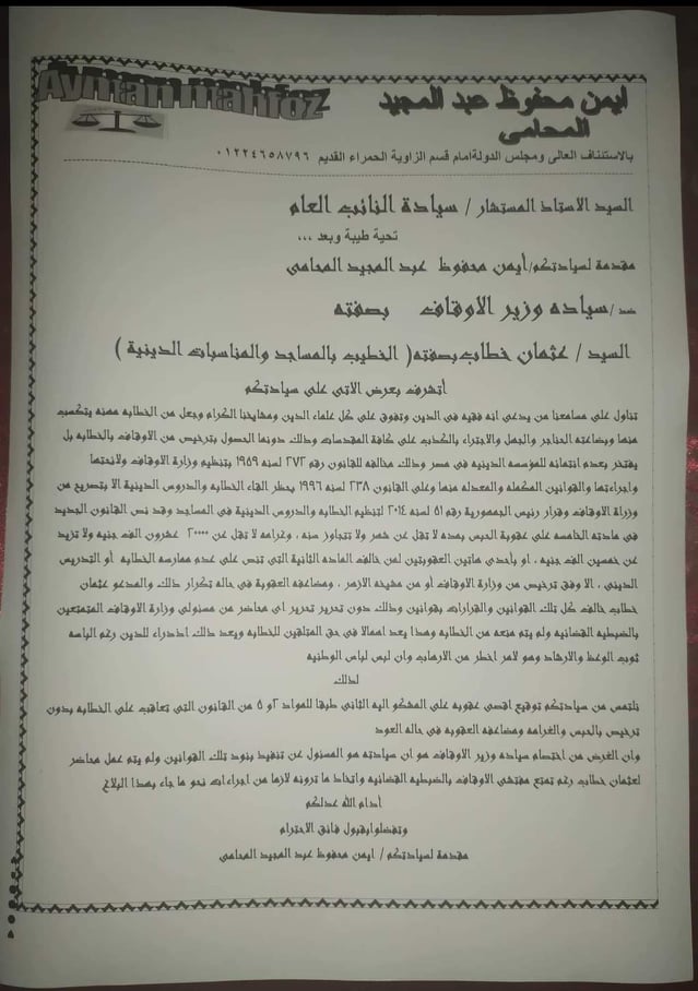 قدم أيمن محفوظ المحامي بلاغا للنائب العام ضد وزير الأوقاف بسبب ظاهرة (الخطيب بلا ترخيص) عثمان خطاب مطالبا بحبسه، وهو الذي يقوم بالخطابه بالمساجد والمناسبات الدينية و يدعي أنه فقيه في الدين وتفوق على كل علماء الدين ومشايخنا الكرام وجعل من الخطابة مهنة يتكسب منها وبضاعته فيها الحناجر والجهل والاجتراء بالكذب على كافه المقدسات، وذلك دونما الحصول بترخيص من الأوقاف بالخطابة.