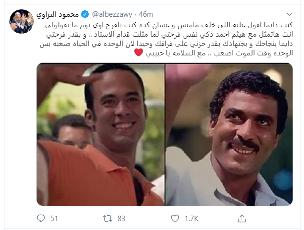وكتب البزاوى، بكلمات كلها حزن و وجع قائلا: "كنت دايما أقول عليه اللى خلف مامتش وعشان كده كنت بافرح أوى يوم ما يقولولى أنت هاتمثل مع هيثم احمد زكي نفس فرحتى لما مثلت قدام الأستاذ .. وبقدر فرحتى دايما بنجاحك وبجتهادك بقدر حزنى على فراقك وحيدا لأن الوحدة فى الحياة صعبة بس الوحدة وقت الموت أصعب مع السلامة يا حبيبى".