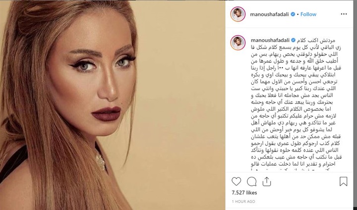 وتابعت : " ارجوكم ارحمونا مش علشان احنا فنانين أو إعلاميين نكون مش بشر أو معندناش دم و احساس بلعكس احنا عندنا اكتر من اَي حد اتمنولها ترجع بسلامه وراعو مشاعر الآخرين واسفه لو كلامي فيه غلط بس نفسي تحبونا زي ما بنحبكم" .