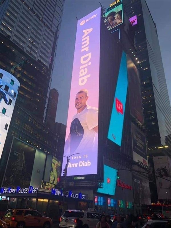 اختفت منصة الموسيقي الأشهر في العالم سبوتيفاي بالنجم العالمي عمرو دياب وذلك بعرض صور ألبومه الجديد "أنا غير" في ميدان تايمز الشهير بنيويورك، في سابقة هي الأولى لمطرب عربي ومصري.