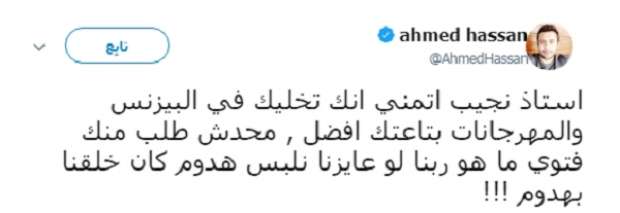 وكتب أحمد حسن، عبر حسابه الشخصي على موقع التدوينات القصيرة "تويتر": "أستاذ نجيب أتمنى إنك تخليك في البيزنس والمهرجانات بتاعتك أفضل، محدش طلب منك فتوى، ما هو ربنا لو عايزنا نلبس هدوم كان خلقنا بهدوم".