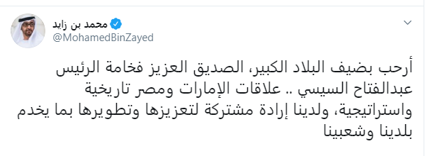 وقال الشيخ محمد بن زايد على تويتر: "أرحب بضيف البلاد الكبير، الصديق العزيز فخامة الرئيس عبدالفتاح السيسي.. علاقات الإمارات ومصر تاريخية واستراتيجية، ولدينا إرادة مشتركة لتعزيزها وتطويرها بما يخدم بلدينا وشعبينا".