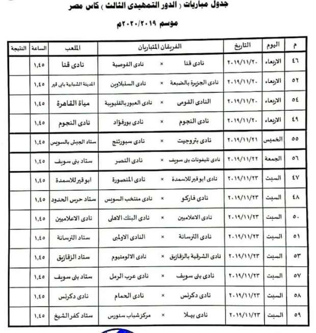 أعلنت إدارة المسابقات بالاتحاد المصري لكرة القدم، مواعيد مباريات الدور التمهيدي الثالث لبطولة كأس مصر، والتي ستقام خلال الفترة من 20 حتى 23 من نوفمبر الجاري.