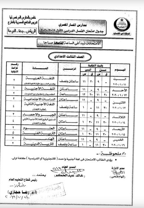 وأوضحت أن امتحانات الصف الثالث الاعدادى تبدأ فى مدارس المسار المصر السبت 11 يناير 2020، وتستمر حتى الخميس 16 يناير 2020، ويؤدى الطالب الامتحان فى لغة أجنبية واحدة الإنجليزية أو الفرنسية كلغة أولى.
