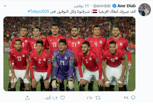 وكتب عمرو دياب على صفحته الشخصية علي موقع التواصل الاجتماعي "تويتر": "ألف مبروك للمنتخب الأولمبي وتمنياتي بكل التوفيق في أولمبياد #Tokyo2020".