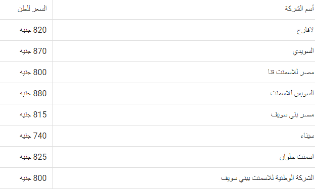 يبلغ سعر طن أسمنت أسيك المنيا والمعروف باسم (أسيك سي وتر): 860 جنيها، ويبلغ سعر طن أسمنت لافارج للأسمنت والمعروف باسم (قاهر البحار)، 890 جنيها، كما بلغ سعر طن أسمنت السويدي المقاوم: 880 جنيها.