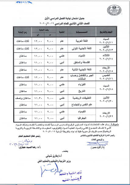 اعتمد الدكتور طارق شوقي، وزير التربية والتعليم، جداول امتحانات نهاية الفصل الدراسي الأول للصفين الأول والثاني الثانوي للعام الدراسي 2020/2019.