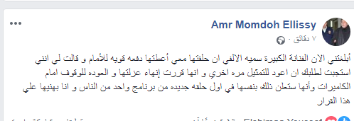 وقال "الليثي" عبر صفحته بموقع التواصل الاجتماعي "فيس بوك": "أبلغتني الآن الفنانة الكبيرة سمية الألفي أن حلقتها معي أعطتها دفعة قوية للأمام وقالت لي إنها استجابت لطلبي أن أعود للتمثيل مرة أخرى وأنها قررت إنهاء عزلتها والعودة للوقوف أمام الكاميرات وأنها ستعلن ذلك بنفسها في أول حلقة جديدة من برنامج واحد من الناس"، مضيفًا: "أنا بهنيها على هذا القرار".