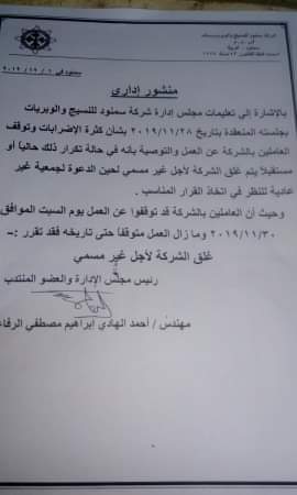 وأضاف، قيام العاملين بالشركة بالتوقف عن العمل يوم السبت الماضى، وما زال العمل متوقفا فتقرر تنفيذ توصية مجلس الإدارة بالإغلاق لأجل غير مسمى.