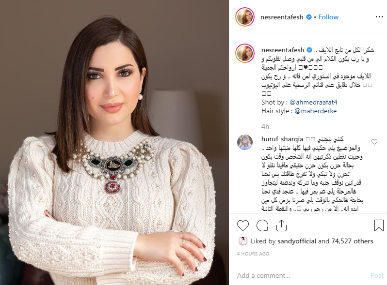 وعلقت نسرين طافش على صورتها ببعض الكلمات، وقالت: شكرا لكل من تابع لايف .. و يا رب يكون الكلام اللي من قلبي وصل قلوبكم و أرواحكم الجميلة ????♥️????.. اللايف موجود في الستوري لمن فاته .. و رح يكون خلال دقائق على قناتي الرسمية على اليوتيوب ????????????????