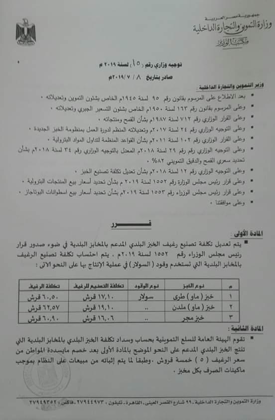 أصدر وزير التموين والتجارة الداخلية توجيهًا وزاريًا رقم (15) لسنة 2019، بشأن تعديل تكلفة تصنيع الخبز المدعم، وذلك للمخابز التي تستخدم السولار كوقود، وأن يكون تكلفة تصنيع الرغيف الخبز الطري 60.50 قرش، وتكلفة إنتاج رغيف الخبز الملدن 62.57 قرش، ورغيف الخيز "محجر" 60.90 قرش، على أن يظل سعر رغيف الخبز للمواطن ثابتًا بـ5 قروش، وأن تتحمل الوزارة فرق التكلفة لأصحاب المخابز.