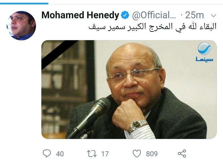 وكتب هنيدي، عبر حسابه على موقع التغريدات "تويتر": "البقاء لله في المخرج الكبير سمير سيف".