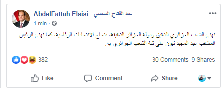 وأضاف الرئيس عبر حسابه الرسمي بموقع التواصل الاجتماعي فيسبوك: "نهنئ الشعب الجزائري الشقيق ودولة الجزائر الشقيقة، بنجاح الانتخابات الرئاسية، كما نهنئ الرئيس المنتخب عبد المجيد تبون على ثقة الشعب الجزائري به".