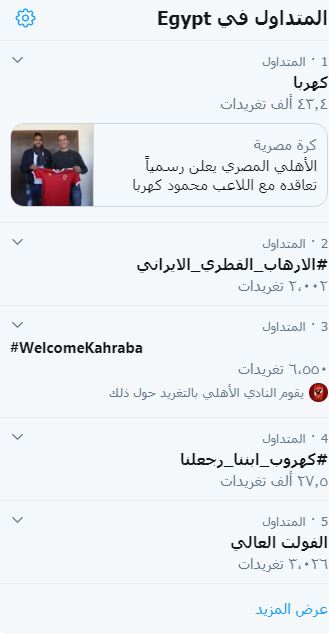 تصدر هاشتاج "كهربا" موقع التواصل الاجتماعي "تويتر" اليوم الجمعة، بعد إعلان أمير توفيق، مدير التسويق والتعاقدات بالنادي الأهلي التعاقد مع اللاعب محمود عبدالمنعم "كهربا" لمدة أربع سنوات ونصف، تبدأ مطلع يناير المقبل.