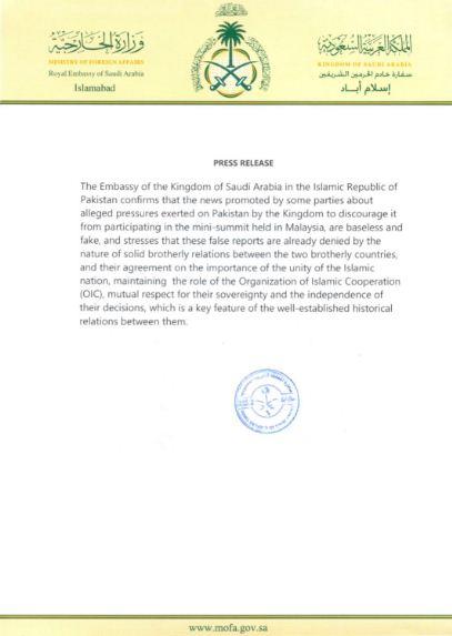 نفت سفارة السعودية في العاصمة الباكستانية، إسلام آباد ،اليوم السبت، صحة الأنباء التي تحدثت عن ضغوط مزعومة مارستها المملكة على باكستان لثنيها عن المشاركة في القمة المصغرة التي عقدت في ماليزيا.