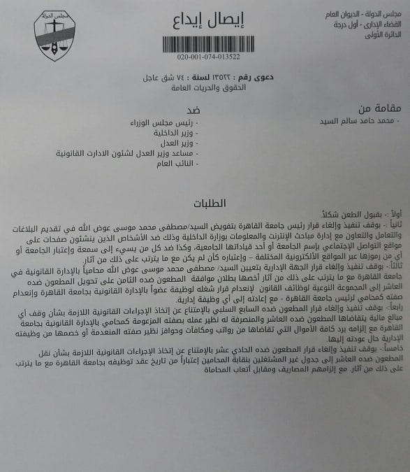 وطالب محمد سالم المحامي، بوقف تنفيذ وإلغاء قرار رئيس جامعة القاهرة بتفويض مصطفى محمد موسى، في تقديم البلاغات والتعامل والتعاون مع إدارة مباحث الإنترنت والمعلومات بوزارة الداخلية وإعتباره كأن لم يكن مع ما يترتب على ذلك من آثار، ووقف تنفيذ وإلغاء قرار الجهة الإدارية بتعيين مصطفى موسى، محاميًا بالإدارة القانونية في جامعة القاهرة، ووقف وتنفيذ وإلغاء قرار رئيس جامعة القاهرة السلبي بالإمتناع عن إتخاذ الإجراءات القانونية اللازمة بشأن وقف أي مبالغ مالية يتقاضاها محاموه والمنصرفة له نظير عمله بصفته المزعومة كمحامي بالإدارة القانونية بجامعة القاهرة، مع إلزامه برد كافة الأموال التي تقاضاها من رواتب ومكافآت وحوافز نظير صفته المنعدمة أو خصمها من وظيفته الإدارية حال عودته إليها.