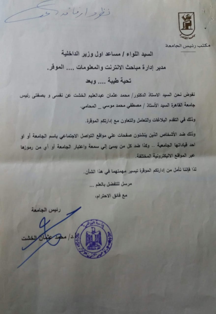 وقال سالم في الطعن، إن رئيس جامعة القاهرة قام بتفويض مصطفى موسى، بصفته محامي عنه، لتقديم البلاغات والتعامل مع وزارة الداخلية ضد الأشخاص الذين يسيئون إلى سمعة واعتبار جامعة القاهرة أو أي من رموزها عبر المواقع الإلكترونية المختلفة، موضحًا أن الكتاب الصادر من “الخشت” إلى مساعد وزير الداخلية، مذيل بتوقيعه وختم شعار الجمهورية دون تاريخ وبدون أرقام اعتماد لشعار الجمهورية.