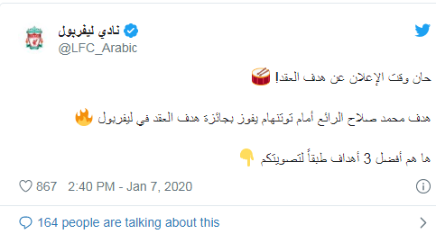وأعلنت الصفحة الرسمية لنادي ليفربول عبر موقع التواصل الاجتماعي "تويتر" عن فوز هدف محمد صلاح في شباك توتنهام بجائزة هدف العقد في قلعة الريدز.