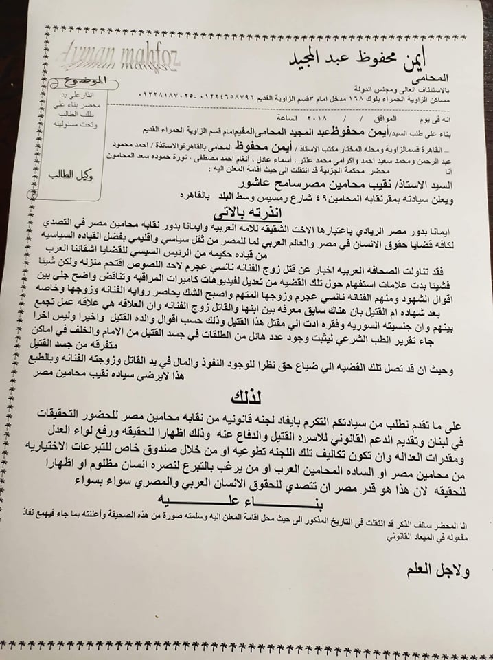 واختتم محفوظ انذاره لنقيب محامين مصر بموجب خطاب موصي به بعلم الوصول مطالبا بايفاد لجنه من نقابه المحامين المصريه لحضور التحقيقات بلبنان لتقديم الدعم القانوني لأسرة القتيل وخوفا من ضياع حقه بنفوذ واموال الفنانه نانسي عجرم.