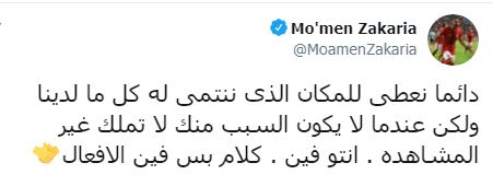كتب مؤمن زكريا تغريدة قال فيها: "دائما نعطي للمكان الذى ننتمى له كل ما لدينا ولكن عندما لا يكون السبب منك لا تملك غير المشاهده.. انتو فين.. كلام بس فين الافعال".