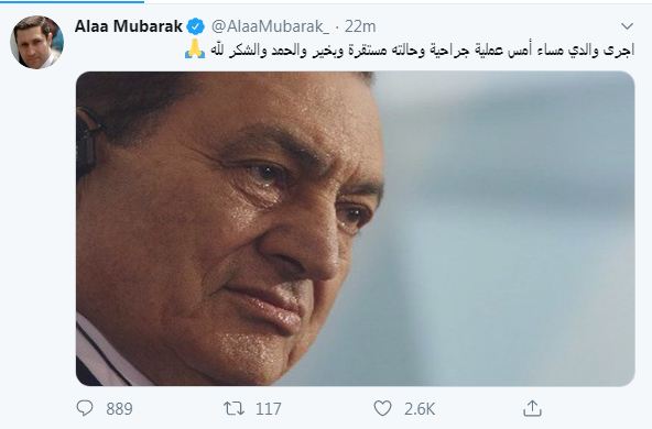وقال علاء مبارك، في تغريدته: "أجرى والدي، مساء أمس، عملية جراحية وحالته مستقرة وبخير والحمد والشكر لله".