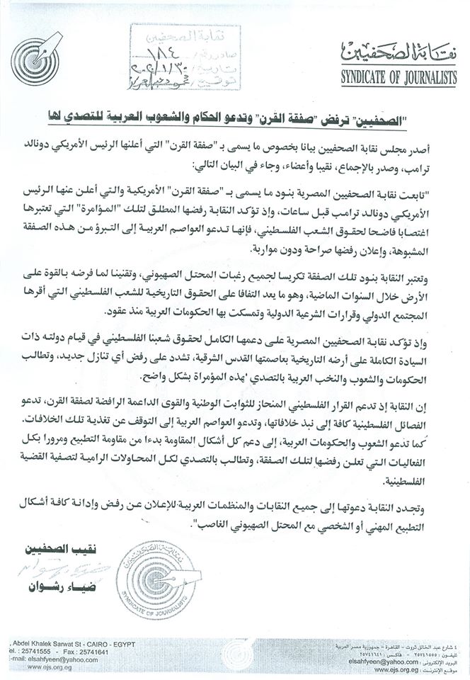 "تابعت نقابة الصحفيين المصرية بنود ما يسمى بـ "صفقة القرن" الأمريكية والتي أعلن عنها الرئيس الأمريكي دونالد ترامب قبل ساعات، وإذ تؤكد النقابة رفضها المطلق لتلك "المؤامرة" التي تعتبرها اغتصابا فاضحا لحقوق الشعب الفلسطيني، فإنها تدعو العواصم العربية إلى التبرؤ من هذه الصفقة المشبوهة، وإعلان رفضها صراحة ودون مواربة.