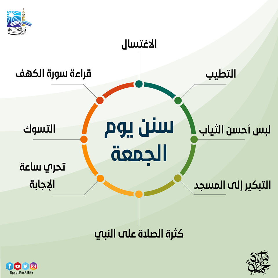 ونشرت الصفحة الرسمية لدار الإفتاء إنفوجراف به عدد من السنن التى يستحب للمسلم أن يفلعها فى يوم الجمعة، مثل: «الاغتسال والتطيب وقراءة سورة الكهف».