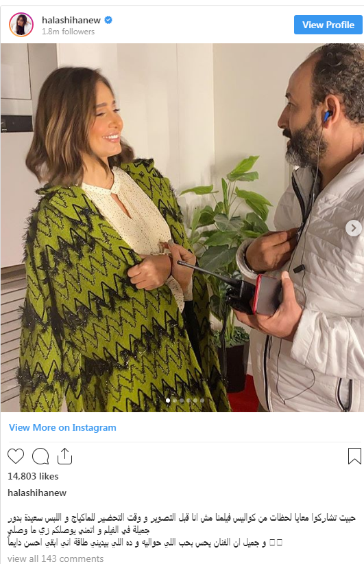 ونشرت صورة لها على حسابها بموقع الصور والفيديوهات "إنستجرام" وعلقت عليها قائلة: "حبيت تشاركوا معايا لحظات من كواليس فيلمنا مش أنا قبل التصوير ووقت التحضير للماكياج واللبس سعيدة بدور جميلة في الفيلم واتمني يوصلكم زي ما وصلي وجميل إن الفنان يحس بحب اللي نحوه وده اللي بيدينى طاقة إني أبقي احسن دايمًا ".