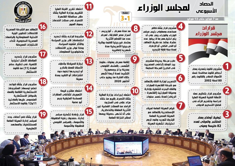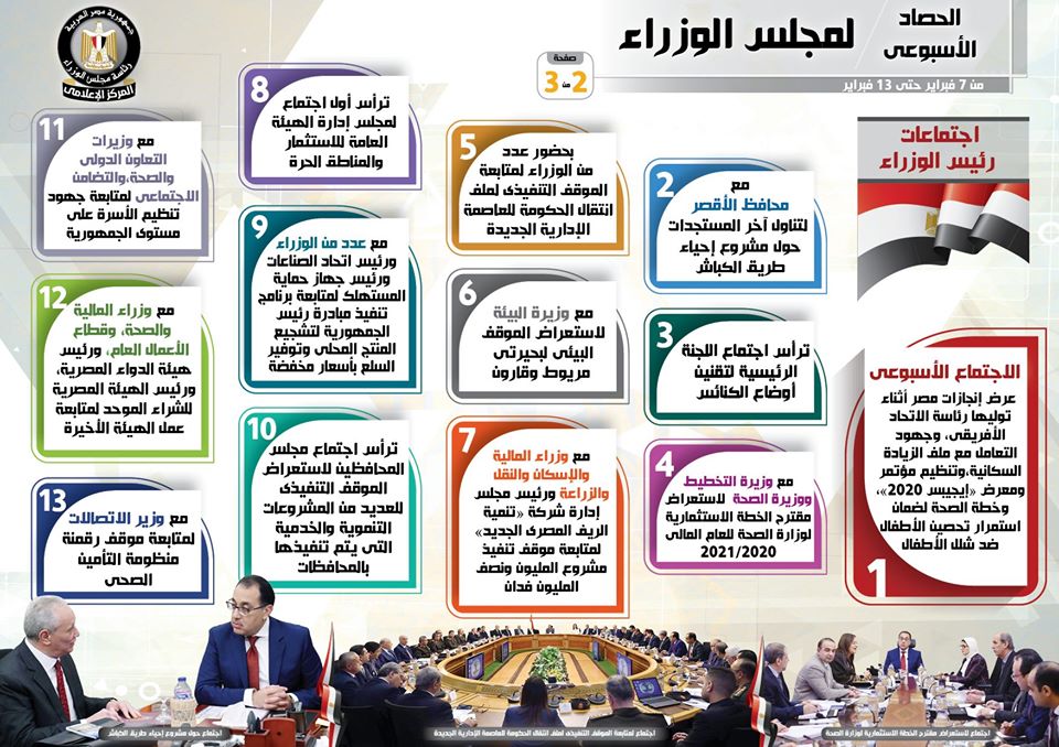 لإنفوجراف... الحصاد الأسبوعي لمجلس الوزراء خلال الفترة من 7 حتى 13 فبراير 2020