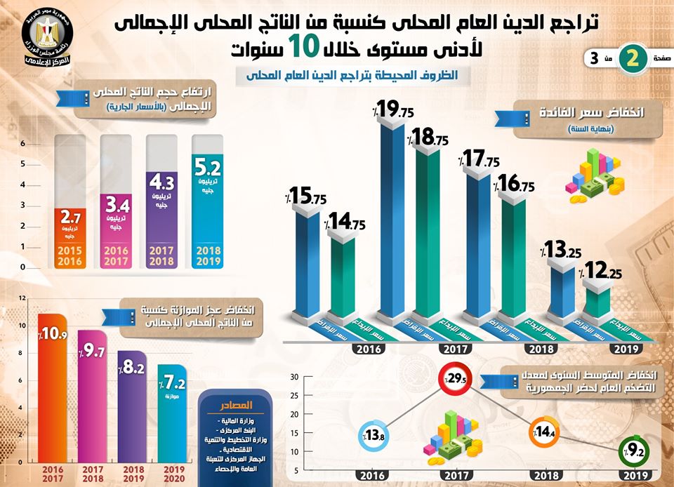 تثبت خطة الإصلاح الاقتصادي التي تبنتها مصر نجاحاً يوماً بعد يوم، ويظهر هذا النجاح في العديد من المؤشرات الإيجابية التي تعبر عن الطفرة الحادثة في الاقتصاد سعياً لتلبية طموحات وآمال المواطن المصري. ومن أهم تلك المؤشرات، تراجع الدين العام المحلي كنسبة من الناتج المحلي الإجمالي لأدنى مستوى له خلال عشر سنوات، وفقاً لإنفو جراف نشره المركز الإعلامي لمجلس الوزراء. وأوضح الإنفو جراف، أن الدين العام المحلي سجل 66.7% كنسبة من الناتج المحلي الإجمالي حتى الربع الأول من عام 2019/2020. وكان الدين العام المحلي قد سجل بحسب الإنفو جراف، أعلى مستوى له عام 2016/2017، مسجلاً 94.5% كنسبة من الناتج المحلي الإجمالي، قبل أن يبدأ اتجاهه نحو الهبوط مع بدء تطبيق برنامج الإصلاح الاقتصادي ونجاحه ليسجل 82.2% عام 2017/2018، و71.9% عام 2018/2019. كما رصد الإنفو جراف، معدلات الدين العام المحلي كنسبة من الناتج المحلي الإجمالي منذ عام 2009/2010 والتي سجلت فيها 63.8%، و68% عام 2010/2011، و66.9% عام 2011/2012، و75.7% عام 2012/2013، و77.7% عام 2013/2014، و81.5% عام 2014/2015، و91.5% عام 2015/2016. وأشار الإنفو جراف، إلى الظروف المحيطة بتراجع الدين العام المحلي والتي تشمل، انخفاض سعر الفائدة الذي سجل 12.25% على الإيداع، و13.25% على الإقراض بنهاية عام 2019، مقارنة بـ 16.75% على الإيداع، و17.75% على الإقراض بنهاية عام 2018، و18.75% على الإيداع، و19.75% على الإقراض بنهاية عام 2017، و14.75% على الإيداع، و15.75% على الإقراض بنهاية عام 2016. وأضاف الإنفو جراف، أن هذا الانخفاض يأتي أيضاً على خلفية انخفاض المتوسط السنوي لمعدل التضخم العام لحضر الجمهورية الذي سجل 9.2% عام 2019، مقارنة بــ 14.4% عام 2018، و29.5% عام 2017، و13.8% عام 2016. واستعرض الانفو جراف، بعض ثمار نجاح برنامج الإصلاح الاقتصادي وعلى رأسها، ارتفاع حجم الناتج المحلي الإجمالي بالأسعار الجارية الذي سجل 5.2 تريليون جنيه عام 2018/2019، مقارنة بـ 4.3 تريليون جنيه عام 2017/2018، و3.4 تريليون جنيه عام 2016/2017، و2.7 تريليون جنيه عام 2015/2016، هذا إلى جانب انخفاض عجز الموازنة كنسبة من الناتج المحلي الإجمالي لتسجل 8.2% عام 2018/2019، مقارنة بـ 9.7% عام 2017/2018، و10.9% عام 2016/2017، ومن المستهدف أن يصل إلى 7.2% بموازنة عام 2019/2020. ورصد الانفو جراف، عدداً من الإشادات الدولية بتراجع الدين العام المحلي، حيث أكد صندوق النقد الدولي أن "عزم الحكومة على الاحتفاظ بفائض أولى في حدود 2% من إجمالي الناتج المحلي على المدى المتوسط سيضمن لها انخفاضاً مطرداً في الدين العام يصل به إلى مستويات يمكن تحملها"، فيما أشار البنك الدولي إلى أن "انخفاض إجمالي الدين الحكومي في مصر خلال العام المالي السابق يرجع إلى انخفاض الجزء المحلي منه"، من جهتها أوضحت فيتش سوليوشنز أن "استقرار خدمة الدين العام يدفع توقعاتنا بمواصلة انخفاض عجز الموازنة العامة كنسبة من الناتج المحلي الإجمالي خلال العام المالي الجاري والمقبل". وفي السياق نفسه، فقد أشارت مؤسسة مورجان ستانلي إلى أن "إجراءات الحكومة بخفض الدعم قد ساهمت في خفض معدلات الدين العام كنسبة من الناتج المحلي الإجمالي خلال عام 2018/2019 مقارنة بـ 2016/2017"، فيما أوضحت بلومبرج أن "مصر تستهدف عائدات منخفضة على الدين المحلي في السنة المالية الحالية، واثقة من أن أوراقها المالية ستبقى محل ثقة بين المستثمرين"، وأخيراً أشارت "جلوبال كابيتال"، إلى حصول مصر على جائزة أفضل وحدة لإدارة الدين العام بالشرق الأوسط وشمال أفريقيا لعام 2019.
