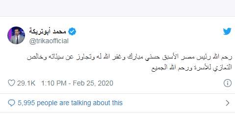 وكتب أبوتريكة، عبر حسابه الشخصي على موقع التواصل الإجتماعي تويتر "رحم الله رئيس مصر الأسبق حسني مبارك وغفر الله له وتجاوز عن سيئاته وخالص التعازي للأسرة ورحم الله الجميع"