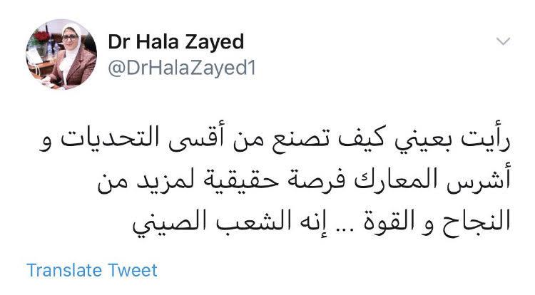 وقالت وزيرة الصحة عبر صفحتها الشخصية بموقع التواصل الاجتماعي "توتير" : "رأيت بعيني كيف تصنع من أقسى التحديات وأشرس المعارك فرصة حقيقة لمزيد من النجاح والقوة.. إنه الشعب الصيني".