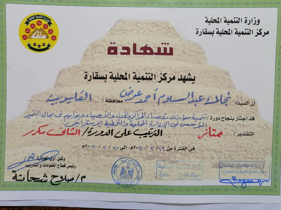 سكرتير عام مركز ومدينة الخانكة لحصولها علي المركز الثاني مكرر في دورة تنمية مهارات رؤساء المراكز والأحياء ونوابهم في مجال التميز المؤسسي في الإدارة المحلية والتخطيط الاستراتيجي، بتقدير ممتاز.
