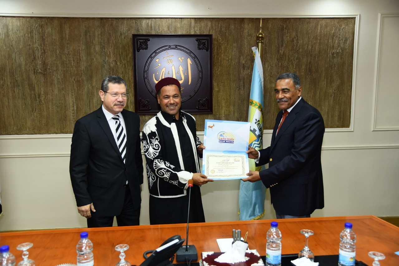 رص اللواء خالد شعيب محافظ مطروح على تكريم القافلة الطبية التنموية لجامعة الاسكندرية بالتعاون مع جامعة مطروح والمنطقة الغربية العسكرية بعد انتهاء اعمالها بحضور الاستاذ الدكتور مصطفى النجار رئيس جامعة مطروح والنائب سليمان فضل والدكتور خالد عبد الغنى وكيل وزارة الصحة