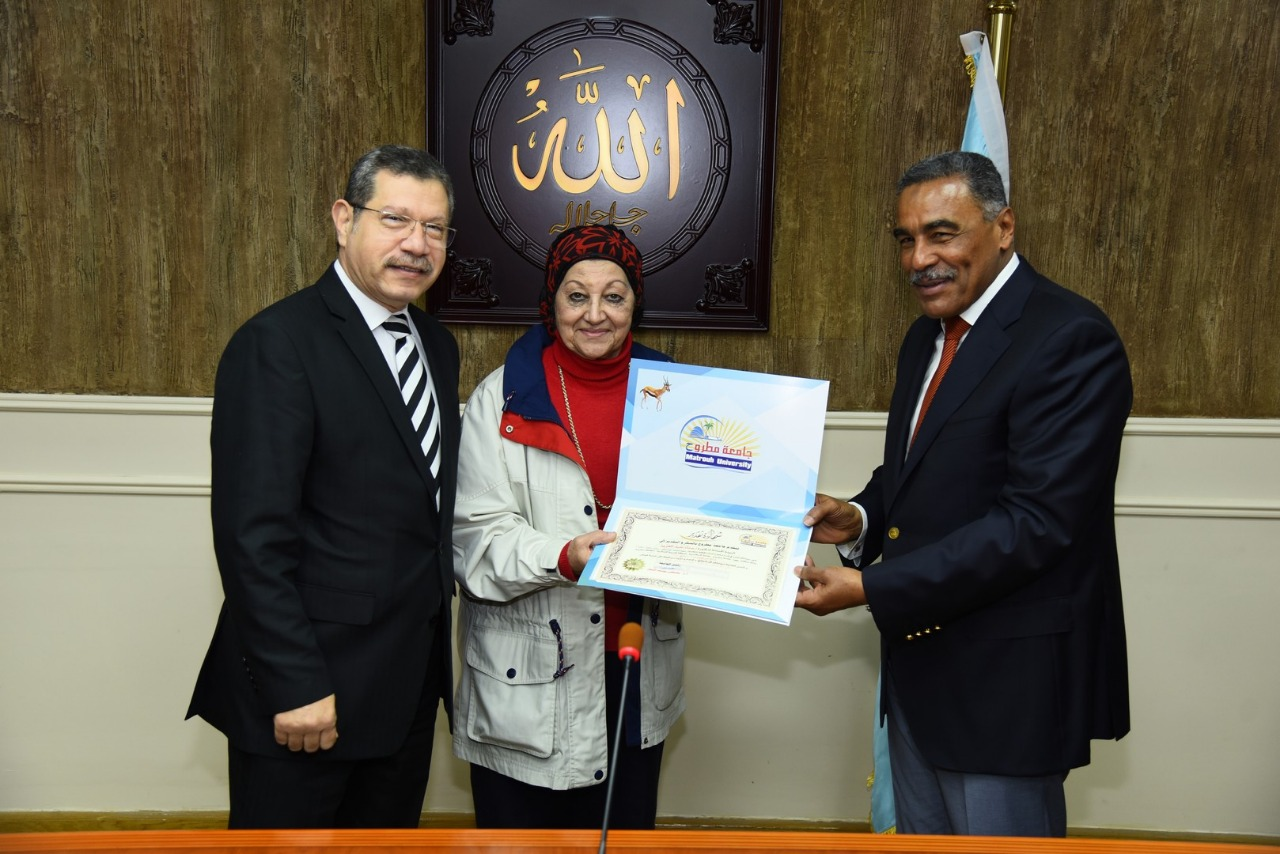 وفى نهاية اللقاء قام اللواء خالد شعيب محافظ مطروح والاستاذ الدكتور مصطفى النجاز بتسليم شهادات التقدير لجميع اعضاء القافلة تقديرا للجهود المبذولة خلال فترة القافلة لخدمة اهالى المحافظة