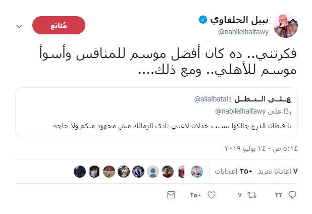ورد الفنان نبيل الحلفاوى قائلا "فكرتني.. ده كان أفضل موسم للمنافس وأسوأ موسم للأهلي.. ومع ذلك....".