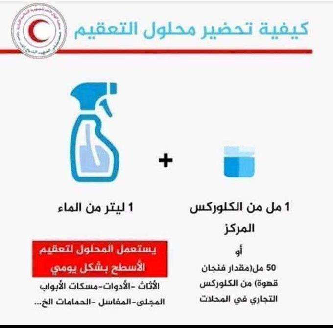نشرت وزارة الصحة، صورة توضيحية لكيفية تحضير محلول تعقيم الأسطح في المنزل دون تكاليف باهظة في إطار حملة التصدي لفيروس الكورونا كوفيد 19 المستجد.