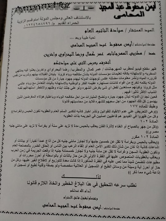 قدم ايمن محفوظ المحامي بلاغا للنائب العام بسبب ظهور مقطع فيديو للمطرب المهرحانات عمر كمال والمطرب رضا البحراواي واخرين يعلنوا بمنتهي السخريه والاستهانه بكافه تعليمات مؤسسات الدوله بشان مكافحه وباء كرونا وتحريض المواطنين علي عدم اتباع تعليمات الوقايه من العدوي وذلك لهدم الجهود الجباره من كافه مؤسسات الدوله لمكافحه الكرونا بكلمه تخرج من افواه اشخاص مستهتره عقيمه الفكر والوطنيه.