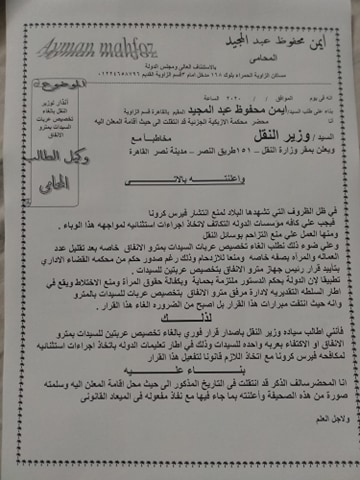 واختتم محفوظ انذاره بكتاب موصي به بعلم الوصول بمطالبة وزير النقل باصدار قرار فوري بالغاء تخصيص عربتين للسيدات بمترو الانفاق او الاكتفاء بعربه واحده للسيدات وذلك في اطار تعليمات الدوله باتخاذ اجراءات استثنائيه لمكافحه فيرس كرونا مع اتخاذ اللازم قانونا لتفعيل هذا القرار.