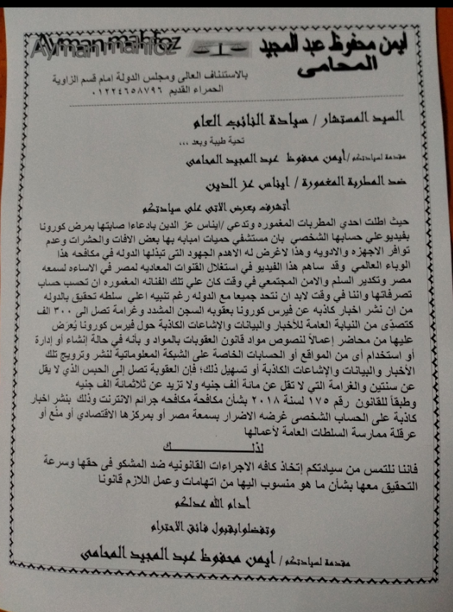 قدم أيمن محفوظ المحامي بلاغا للنائب العام ضد المطربة إيناس عز الدين جاء فيه؛ حيث أطلت المطربة المغمورة إيناس عز الدين بادعاء إصابتها بمرض كورونا بفيديو علي حسابها الشخصي جاء به بان مستشفي حميات إمبابه بها بعض الآفات والحشرات وعدم توافر الأجهزه والادويه لمكافحه فيرس كرونا بالمستشفي.
