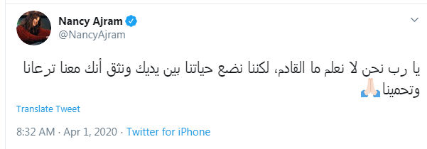 وغردت نانسي قائلة: "يا رب نحن لا نعلم ما القادم، لكننا نضع حياتنا بين يديك ونثق أنك معنا ترعانا وتحمينا".